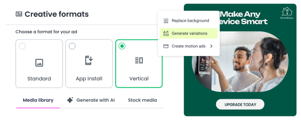 Leverage multiple formats across various placements, using intuitive tools to re-use existing assets and maximize top-performing social creatives.